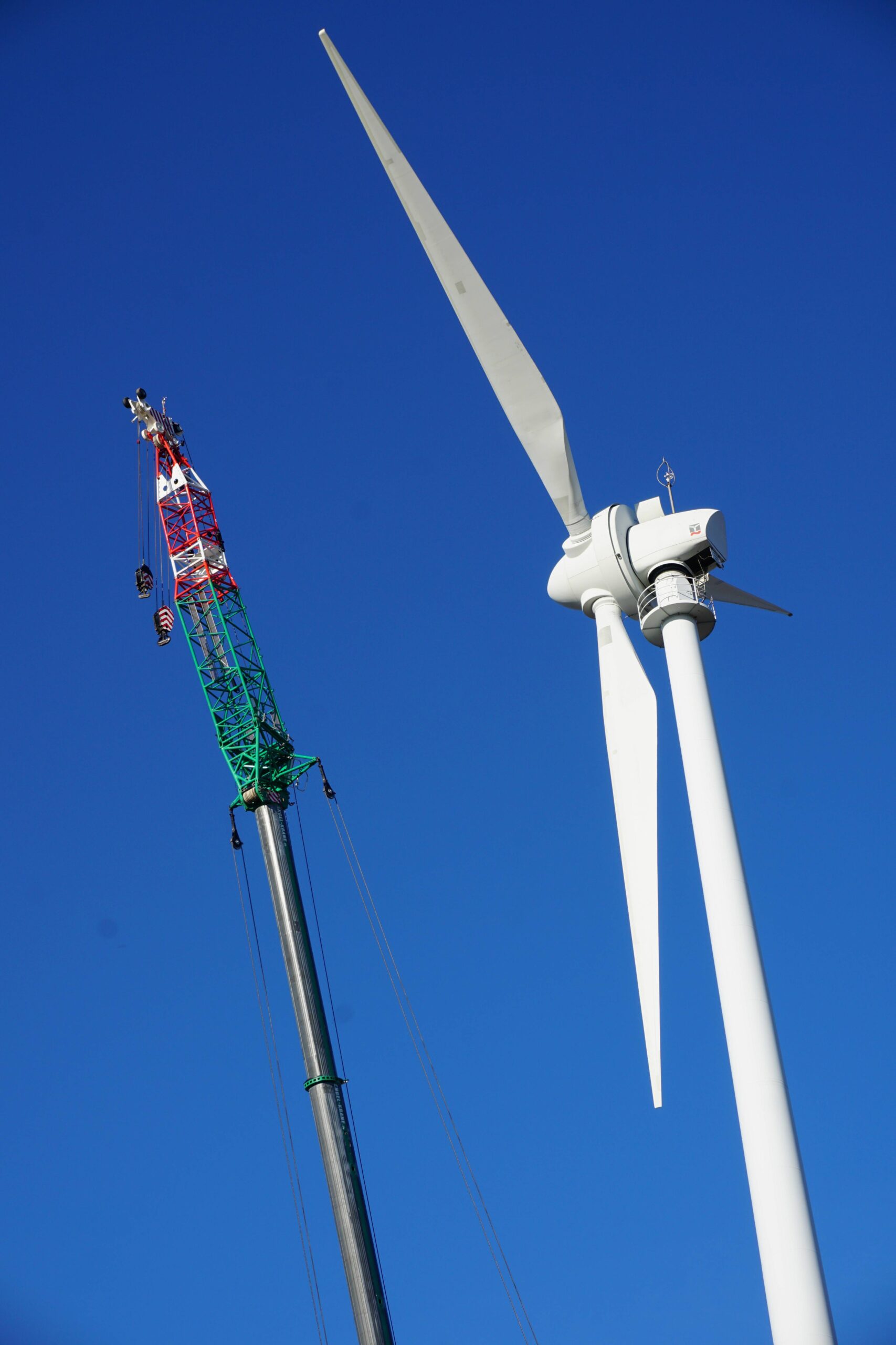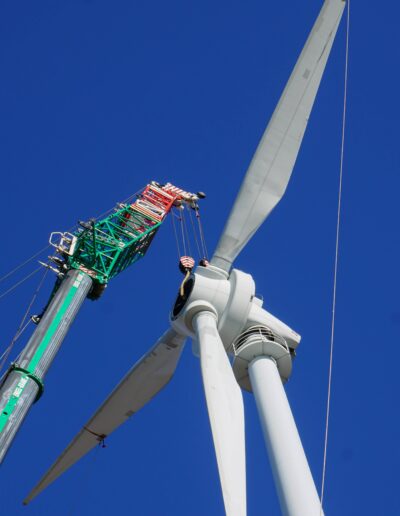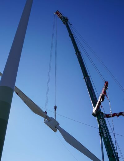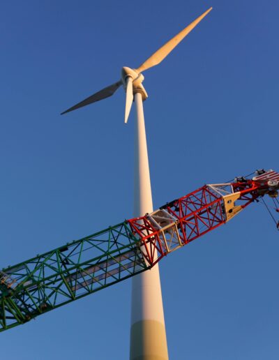 Das 26 Jahre alte Windrad mit einer Nabenhöhe von 65m und einer Ringgenerator-Leistung von 500 kW sollte aus alterstechnischen Gründen ausrangiert werden. Hierfür wurde der 60m lange Hauptausleger des Grove GMK6450-1 um eine um 3° abgewinkelte und 16m lange, feste Hauptauslegerverlängerung ergänzt. Ziel war es, die drei Rotorblätter mitsamt Rotornabe in nur einem Hub zu entfernen.