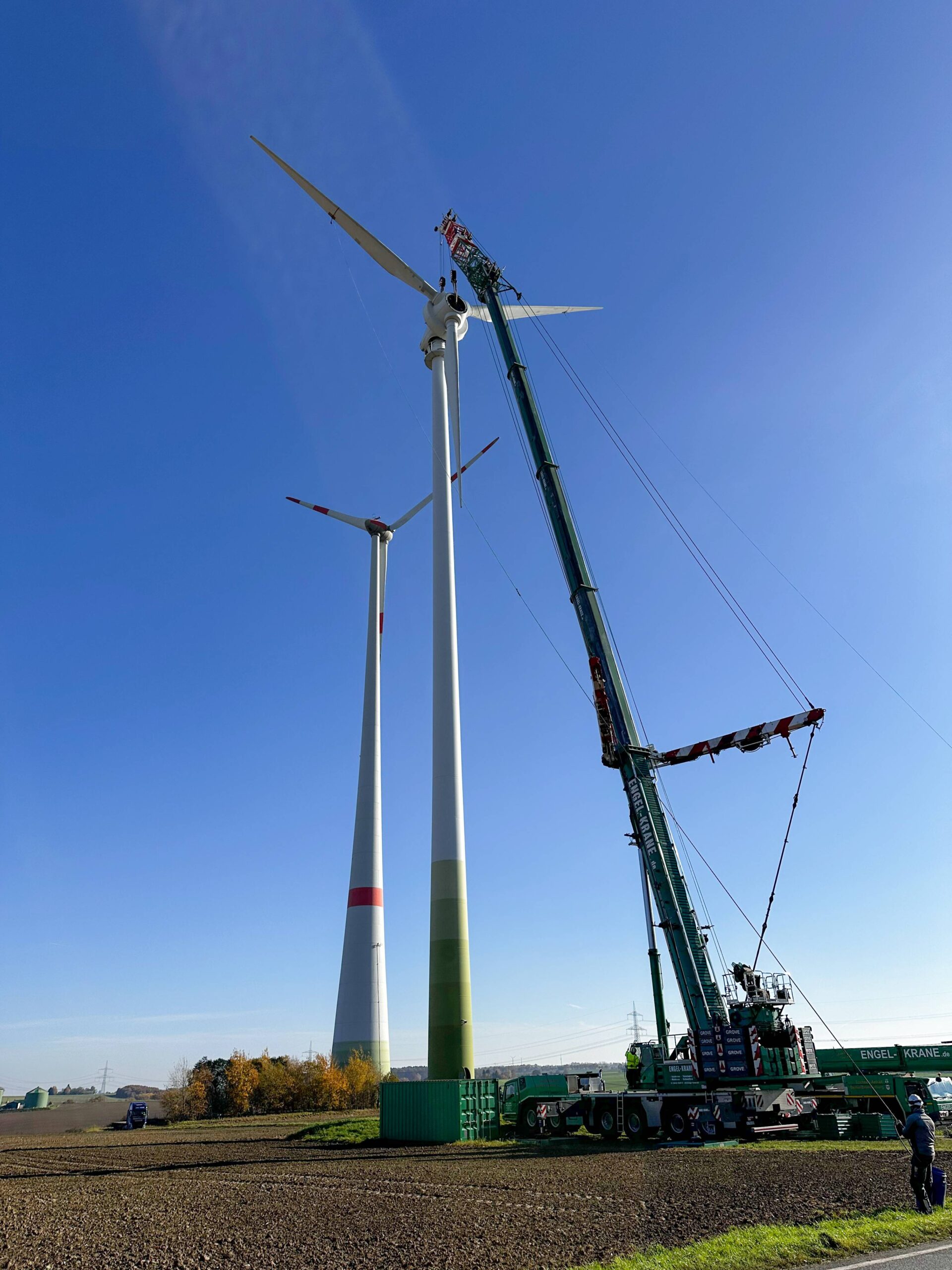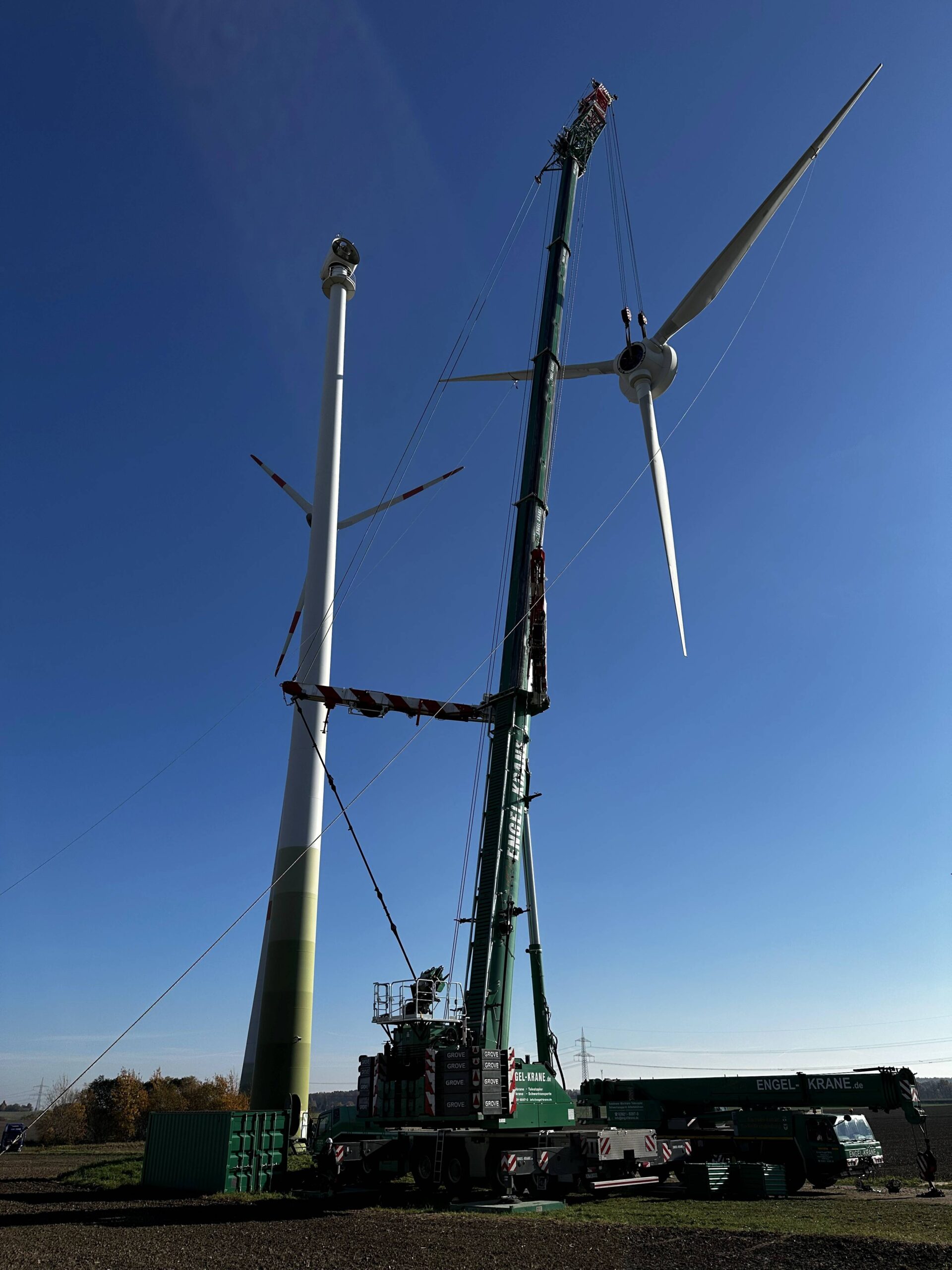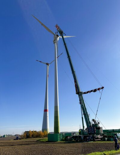In der Nähe des sächsischen Colditz konnten Spaziergänger in der ersten Novemberwoche inmitten der spätherbstlichen Szenerie einen grünen Grove GMK 6450-1 im benachbarten Windpark entdecken. Der 6-achsige Mobilkran der in Burg bei Magdeburg ansässigen Firma Engel Krane wurde hier mit einem speziellen Hub beauftragt: Der Demontage einer Enercon E40/5.40 Windkraftanlage.